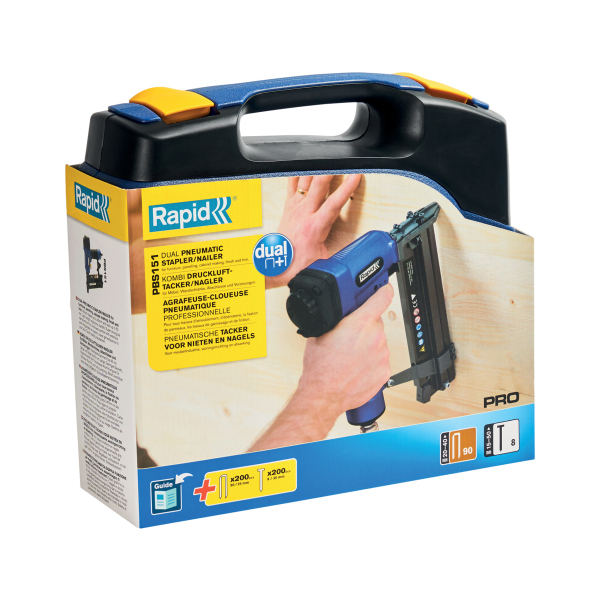 Capsator pneumatic profesional dual pentru capse si cuie. Ideal pentru mobilier cu ritm ridicat, lambriuri, dulapuri, lucrări de confecţionare, finisare şi tăiere.